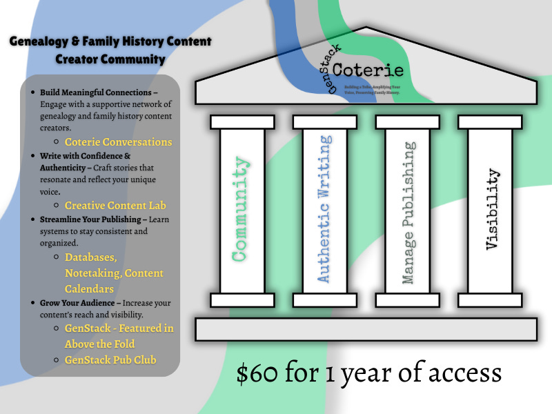 If you’re a content creator yourself — whether you write a family history blog, publish a Substack newsletter, or produce genealogy videos or podcasts — the GenStack Coterie is your community. This private membership helps you: