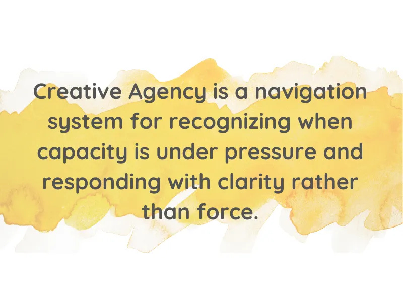 My book, Creative Agency, is a practical path for making meaningful work sustainable. It helps you notice what is actually under pressure, name the signal, and choose a response that fits. Inside you will find the Four Domains, 25 common challenges with reflection prompts, and a Strategy Bank you can draw from when momentum drops or the work starts to feel heavy.