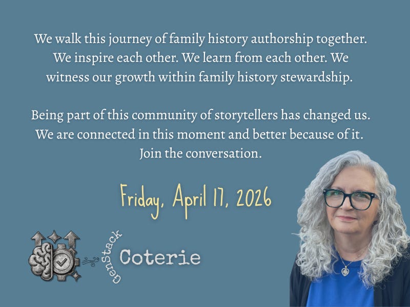 Our Coterie Collab is a space for family historians to come together and talk about what it really takes to tell these stories well. This meeting, we’re diving into Stewardship Matters — what it means, why it matters, and what it looks like in practice for Coterie members.